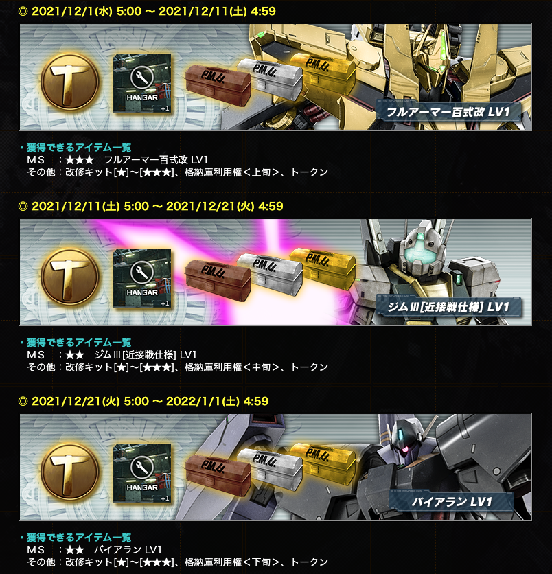 2021年11月30日 ■2021年12月のプレミアムログインボーナス一覧 ・獲得できるアイテム一覧 MS◎ 2021/12/1(水) 5:00 ~ 2021/12/11(土) 4:59★★★ フルアーマー百式改 LV1 ◎ 2021/12/11(土) 5:00 ~ 2021/12/21(火) 4:59 ★★ ジムⅢ[近接戦仕様] LV1◎ 2021/12/21(火) 5:00 ~ 2022/1/1(土) 4:59 ★★ バイアラン LV1 < 前の記事次の記事 > コメント コメントフォーム 名前 コメント 記事の評価 リセット リセット 顔 星 情報を記憶 コメントを投稿する